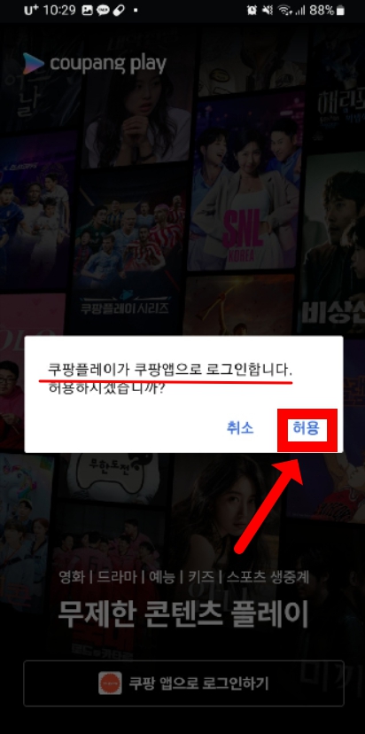3) 쿠팡플레이 앱에 접속하여 쿠팡 앱으로 로그인하기를 클릭 후 쿠팡앱으로 로그인을 허용합니다.