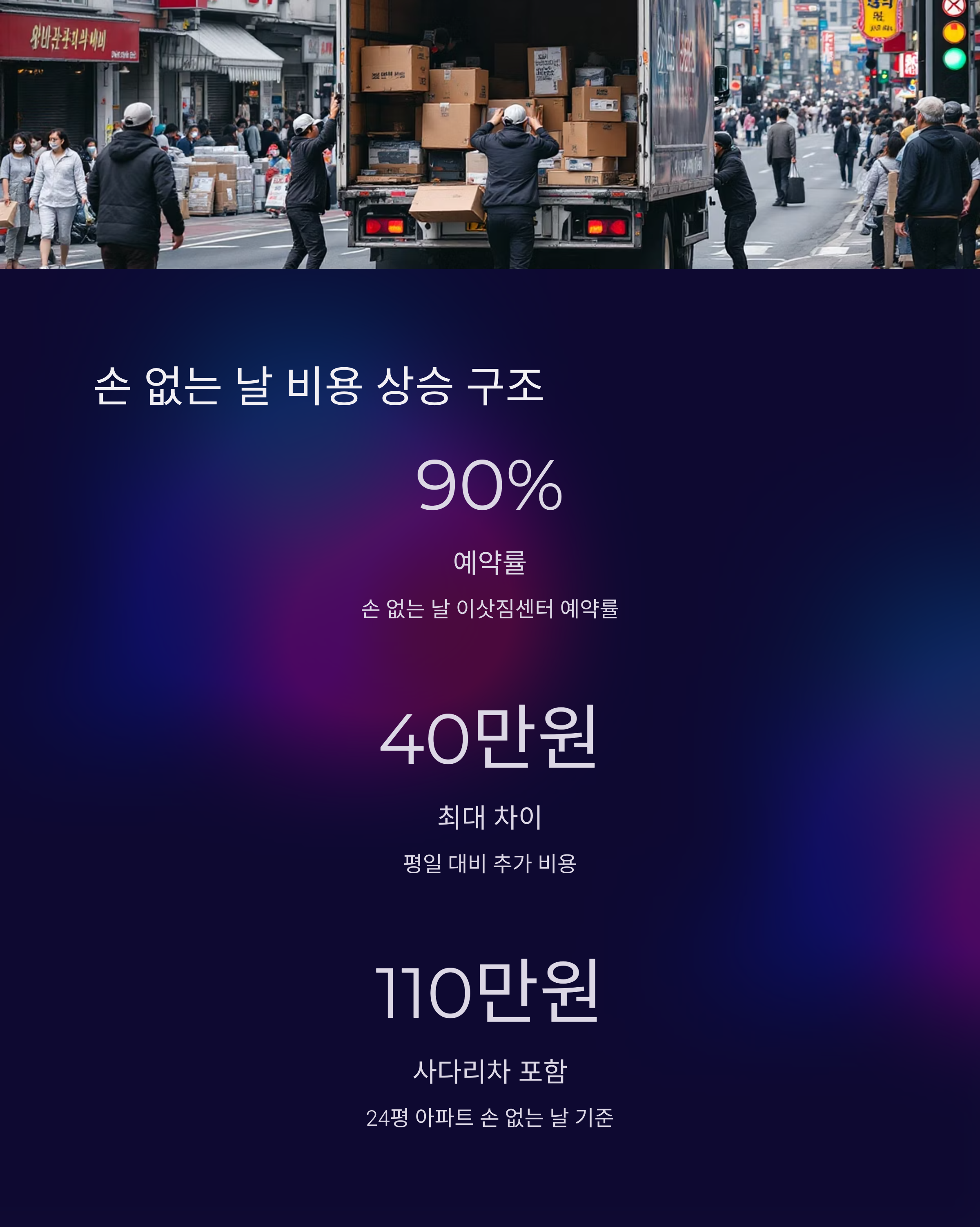 즉, 손 없는 날이어도 오후 타임으로 잡으면 비용 상승을 어느 정도 상쇄할 수 있습니다
