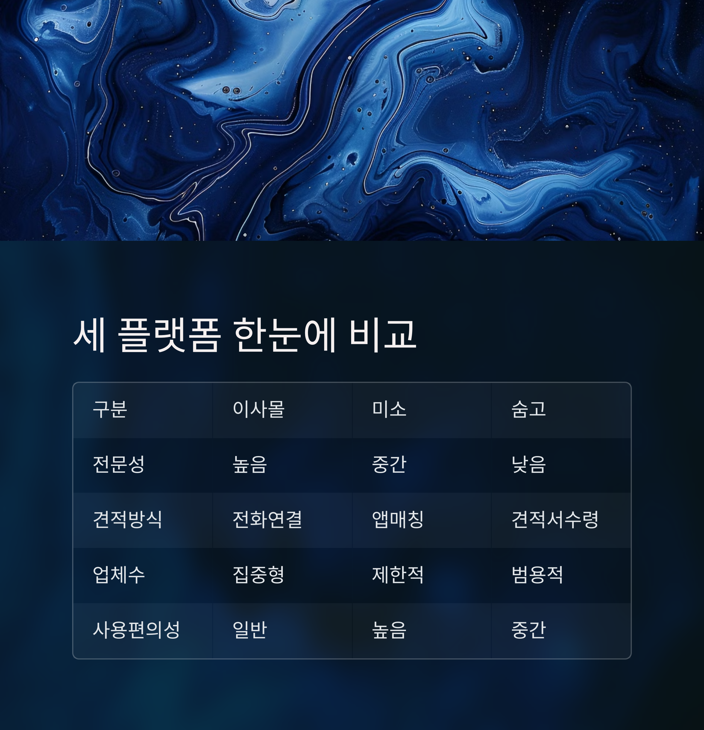 | 비교 항목 | 이사몰 | 미소 | 숨고 |
