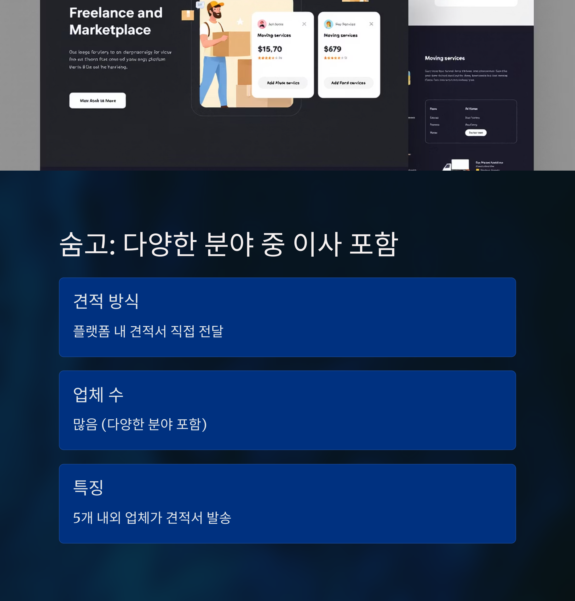 프리랜서 견적 플랫폼으로 이사를 포함한 다중 분야 지원을 합니다