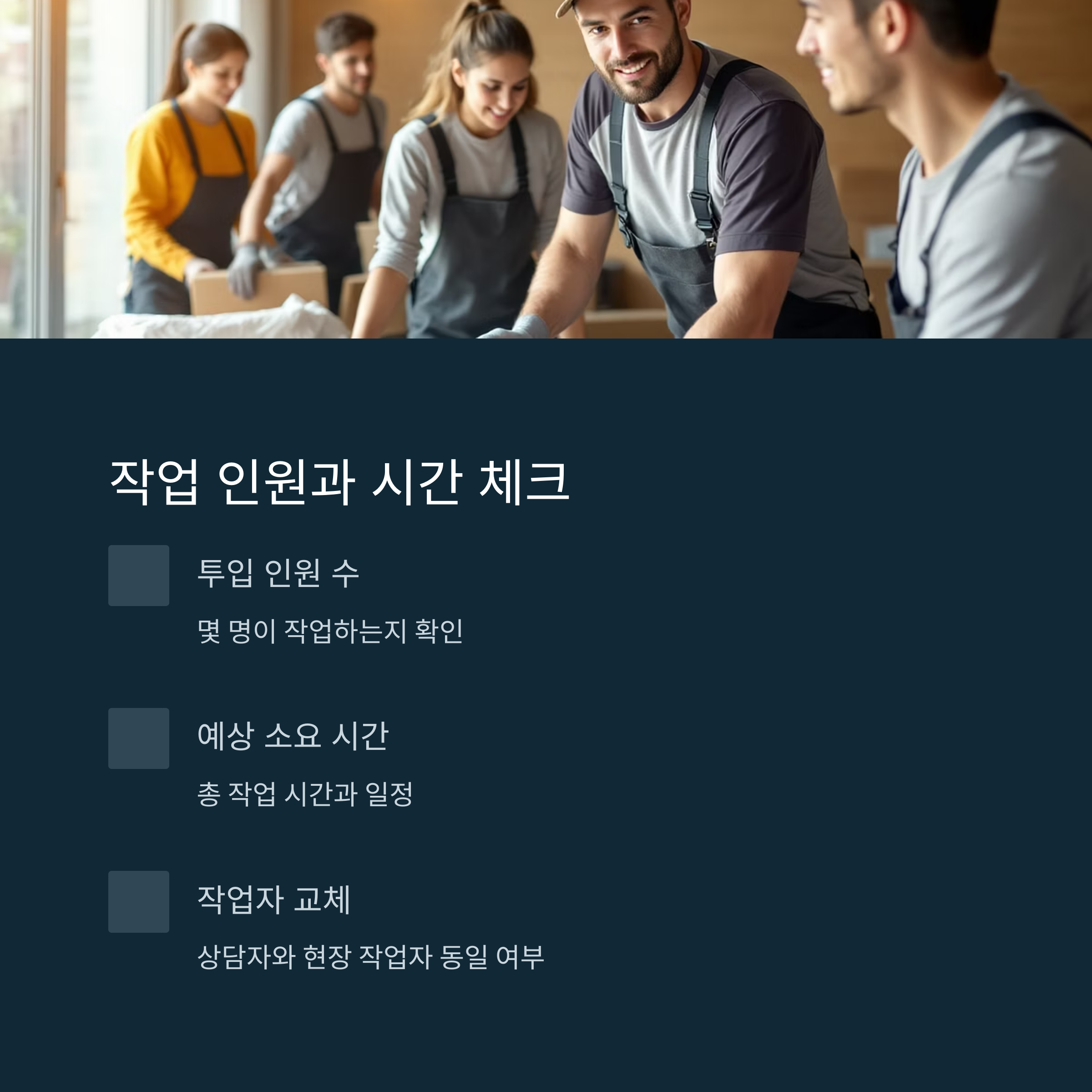 몇 명이 투입되는지, 예상 소요 시간은 몇 시간인지 반드시 확인하고